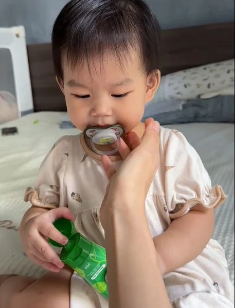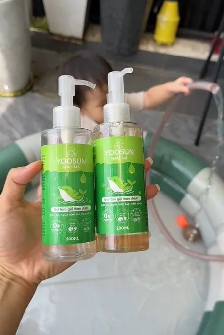 “Trong nhà mình lúc nào cũng sẵn kem bôi, Yoosun là thương hiệu Việt, uy tín, lâu năm rồi. Thành phần có chứa dịch chiết rau má lành tính, không paraben, không cordticoid nên là dùng được cho cả da nhạy cảm, bạn Dứa mà bị mẩn ngứa là mình bôi luôn cho nhanh khỏi, vết nào mà bạn ấy gãi xước da thì nó cũng nhanh lành hơn, hạn chế để lại sẹo mà giá lại bình dân, dễ dàng mua ở các hiệu thuốc, các cửa hàng mẹ và bé. Sữa tắm của Dứa cũng sắp hết rồi, săn sale nên mình mua luôn cả gel tắm bên này”